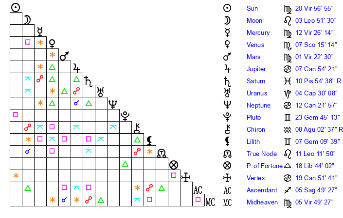 | Sun | 20 Virgo 57 | 22 Virgo 8 | 20 Capricorn 21 |