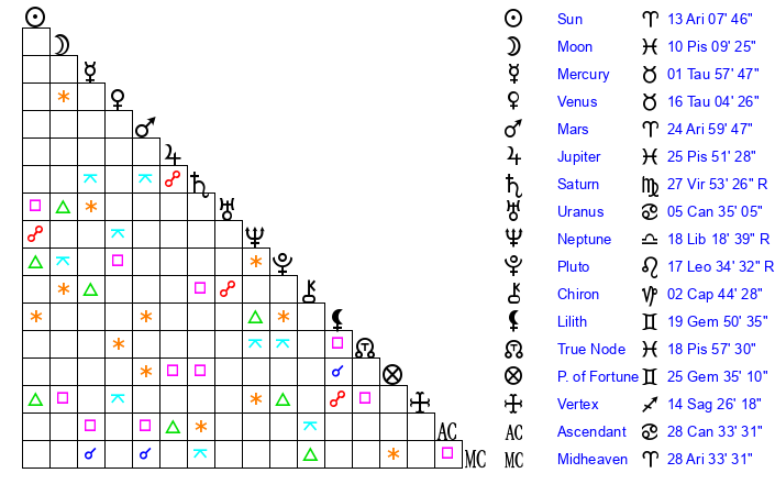 | Mars | 25 Aries 0 | 24 Cancer 31 | 18 Gemini 13 |