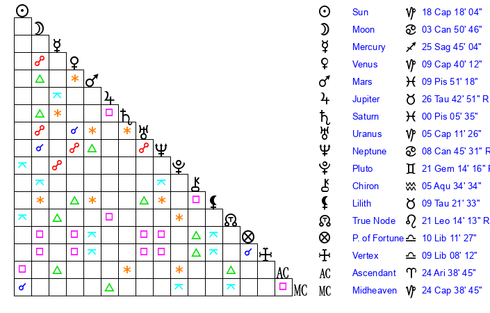 | Mercury | 25 Sagittarius 45 | 1 Capricorn 28 | 21 Aries 0 |