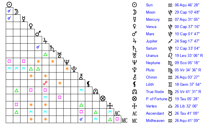 | Moon | 29 Capricorn 16 | 14 Capricorn 55 | 13 Gemini 42 |