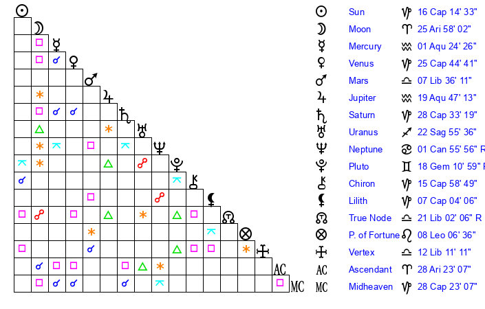 | Venus | 25 Capricorn 45 | 17 Capricorn 39 | 26 Gemini 32 |
