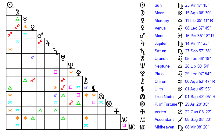 | Neptune | 28 Libra 51 | 0 Aries 56 | 1 Scorpio 19 |