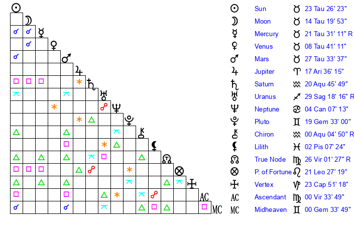 | Moon | 14 Taurus 24 | 16 Sagittarius 18 | 29 Libra 18 |