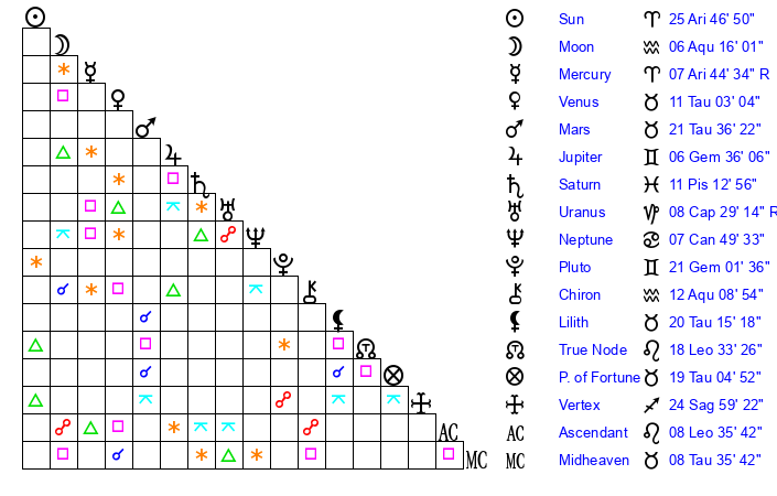 | Sun | 25 Aries 47 | 26 Aries 57 | 20 Leo 0 |