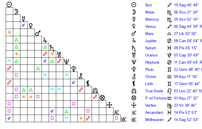 | Venus | 0 Sagittarius 45 | 14 Sagittarius 56 | 10 Pisces 8 |