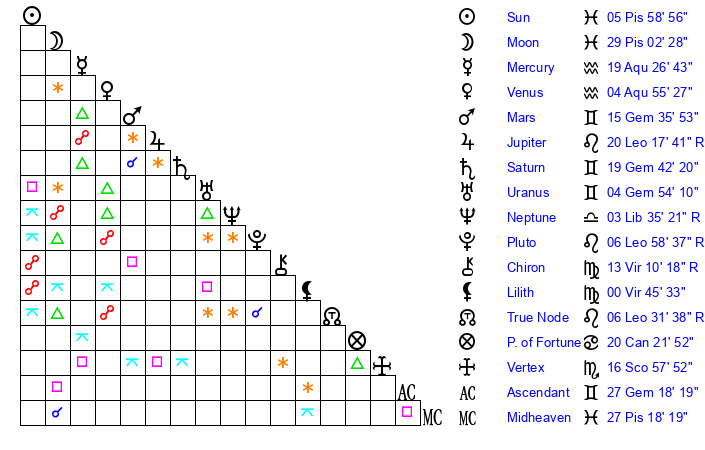| Moon | 29 Pisces 2 | 6 Aquarius 26 | 12 Pisces 6 |