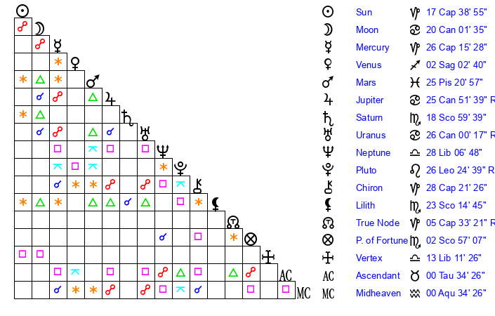 | Saturn | 19 Scorpio 27 | 15 Pisces 5 | 21 Scorpio 24 |