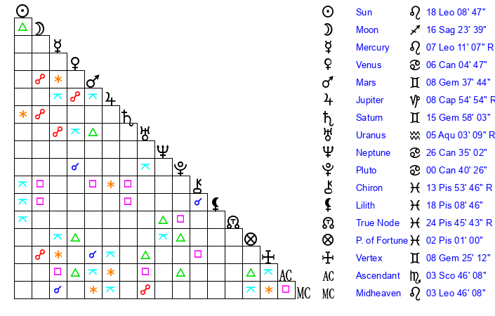 | Moon | 16 Sagittarius 26 | 16 Pisces 13 | 21 Capricorn 38 |
