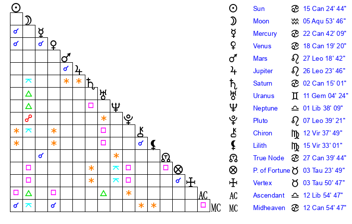 | Pluto | 7 Leo 39 | 2 Aquarius 59 | 9 Leo 48 |