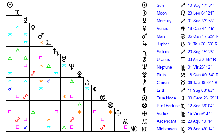 Moon | 23 Leo 0 | 27 Sagittarius 50 | 15 Aquarius 38 |