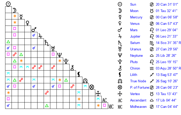 | Moon | 1 Taurus 25 | 26 Aquarius 16 | 1 Sagittarius 31 |