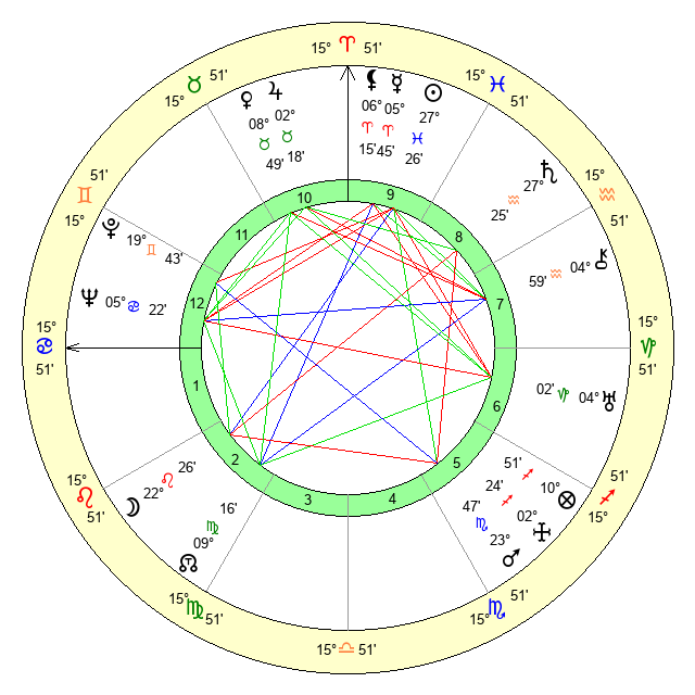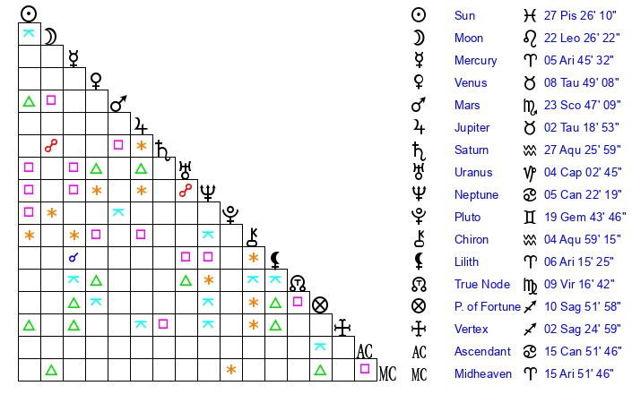 | Sun | 27 Pisces 26 | 28 Pisces 21 | 23 Cancer 27 |