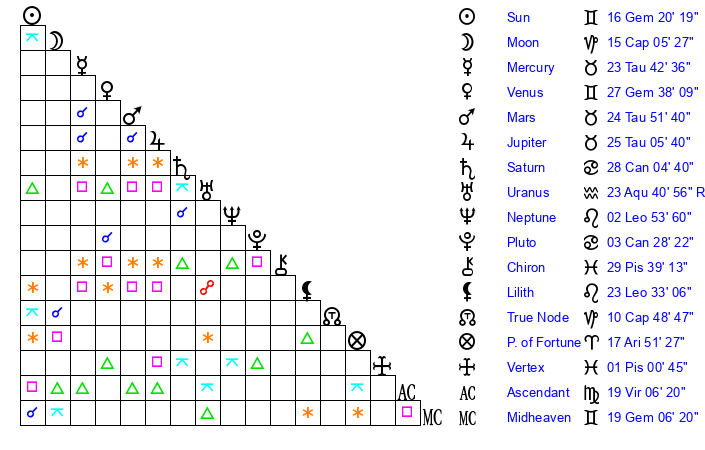 | Sun | 16 Gemini 20 | 17 Gemini 12 | 0 Libra 4 |