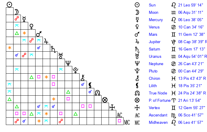 | Moon | 6 Aquarius 26 | 12 Taurus 42 | 11 Pisces 1 |