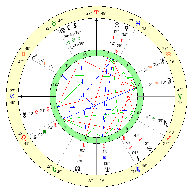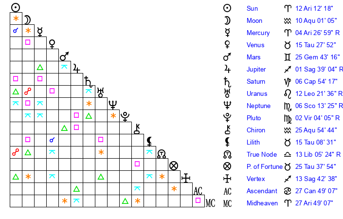 | Moon | 10 Aquarius 0 | 12 Gemini 27 | 29 Gemini 42 |