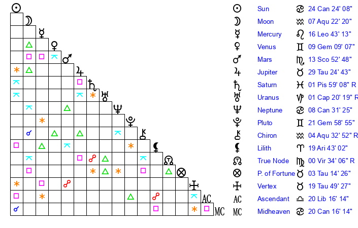 | Moon | 7 Aquarius 16 | 21 Aries 6 | 19 Gemini 15 |