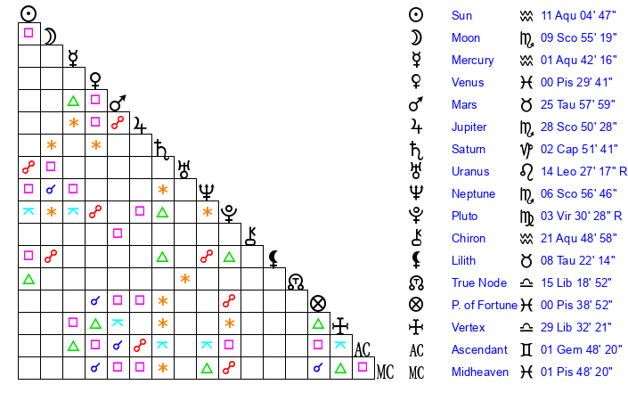 | Moon | 9 Scorpio 54 | 10 Pisces 40 | 12 Aries 9 |
