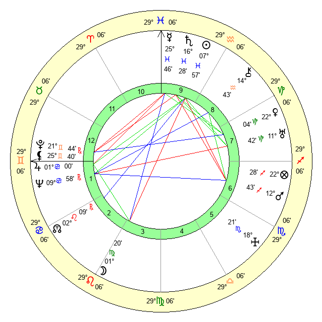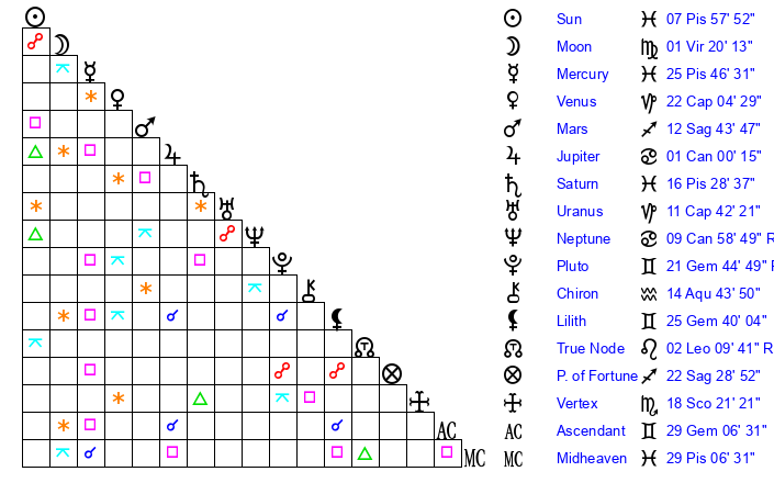 | Sun | 7 Pisces 58 | 9 Pisces 21 | 2 Cancer 58 |
