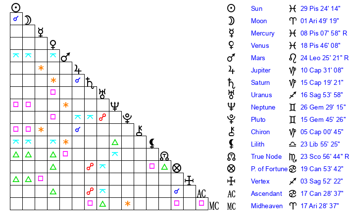 | Neptune | 26 Gemini 29 | 29 Pisces 37 | 0 Cancer 6 |
