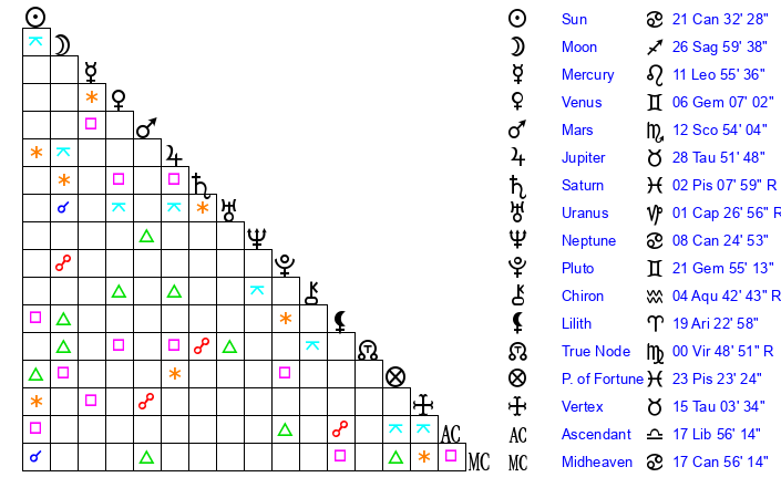 | Sun | 21 Cancer 32 | 22 Cancer 30 | 18 Scorpio 39 |