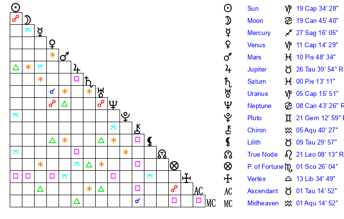 | Sun | 19 Capricorn 34 | 20 Capricorn 42 | 18 Taurus 9 |