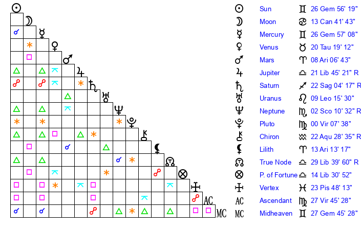 | Mercury | 26 Gemini 57 | 18 Cancer 0 | 29 Leo 1 |