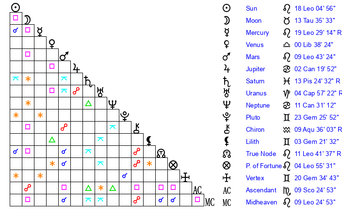 | Moon | 13 Taurus 41 | 19 Pisces 42 | 11 Virgo 18 |