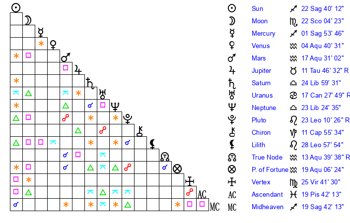 | Neptune | 23 Libra 25 | 29 Pisces 22 | 23 Libra 36 |
