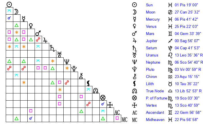 | Venus | 25 Pisces 22 | 9 Aries 11 | 15 Gemini 5 |