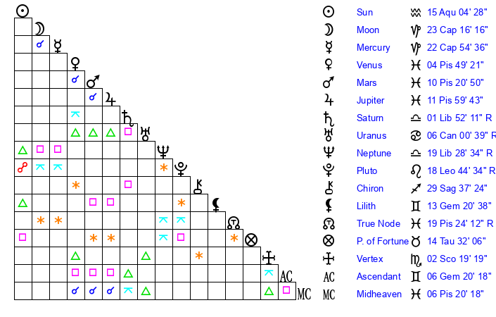 | Neptune | 19 Libra 28 | 28 Pisces 4 | 17 Libra 52 |
