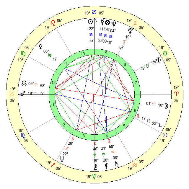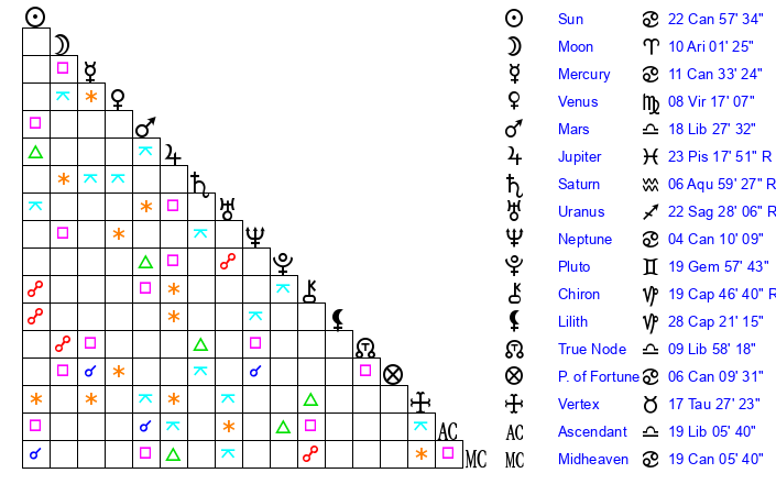 | Sun | 22 Cancer 57 | 24 Cancer 25 | 22 Scorpio 10 |