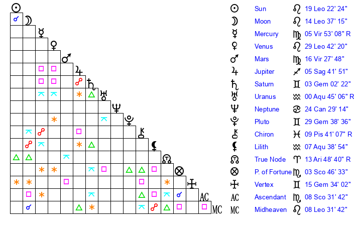 | Sun | 19 Leo 22 | 20 Leo 2 | 10 Sagittarius 59 |