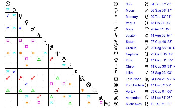 | Uranus | 20 Sagittarius 52 | 26 Taurus 2 | 17 Sagittarius 13 |