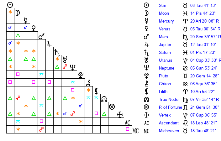 | Moon | 14 Pisces 40 | 6 Gemini 33 | 26 Cancer 14 |