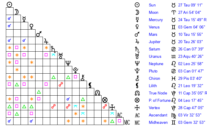 | Sun | 27 Taurus 9 | 28 Taurus 0 | 10 Virgo 35 |