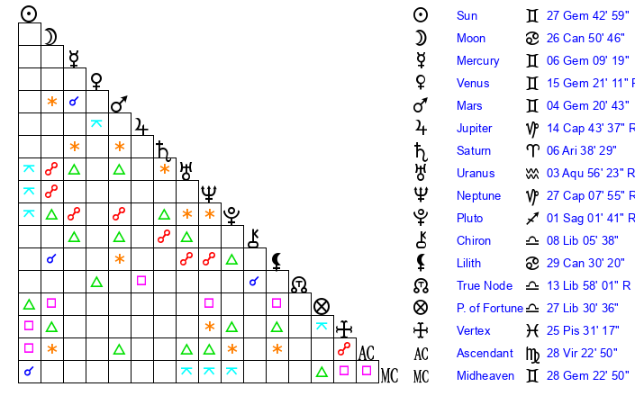Sun | 27 Gemini 43 | 27 Gemini 42 | 25 Cancer 22 |