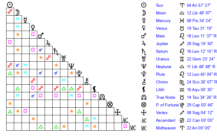 Sun | 4 Aries 57 | 5 Aries 18 | 19 Gemini 41 |