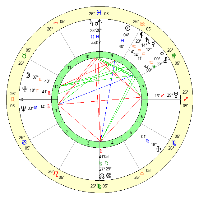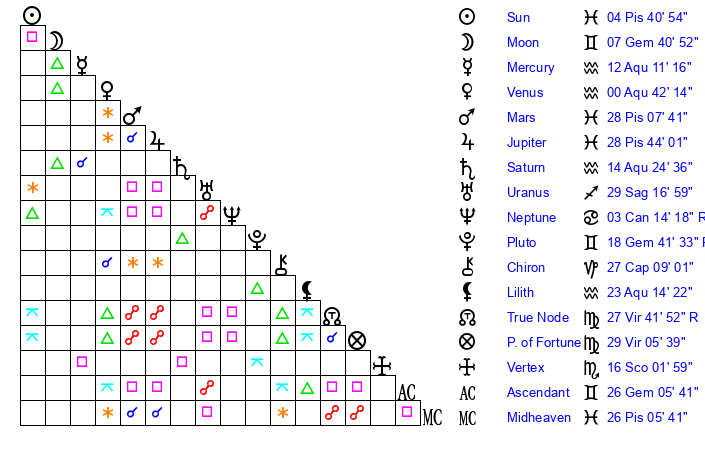 | Sun | 4 Pisces 41 | 6 Pisces 20 | 2 Cancer 42 |