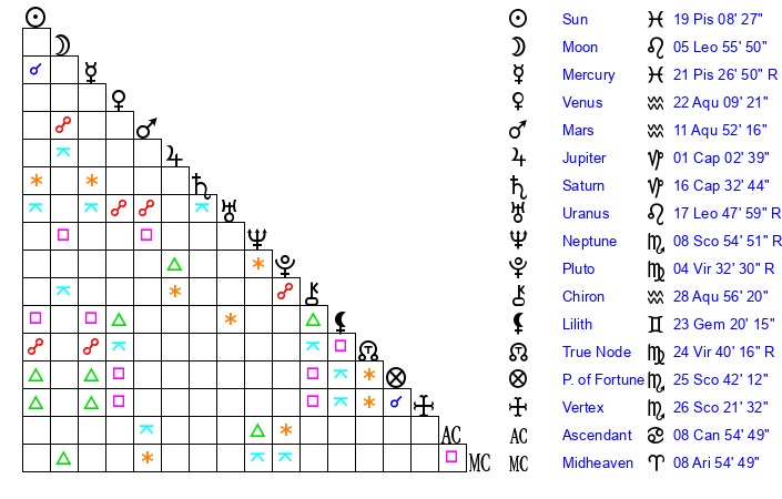 | Neptune | 8 Scorpio 54 | 29 Pisces 13 | 7 Scorpio 20 |