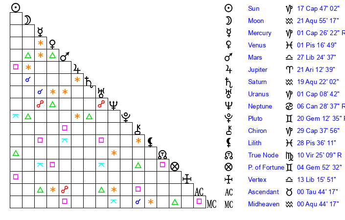 | Saturn | 19 Aquarius 48 | 26 Pisces 34 | 2 Pisces 21 |