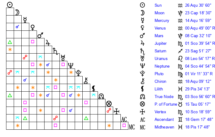 | Neptune | 4 Scorpio 44 | 28 Pisces 25 | 3 Scorpio 25 |