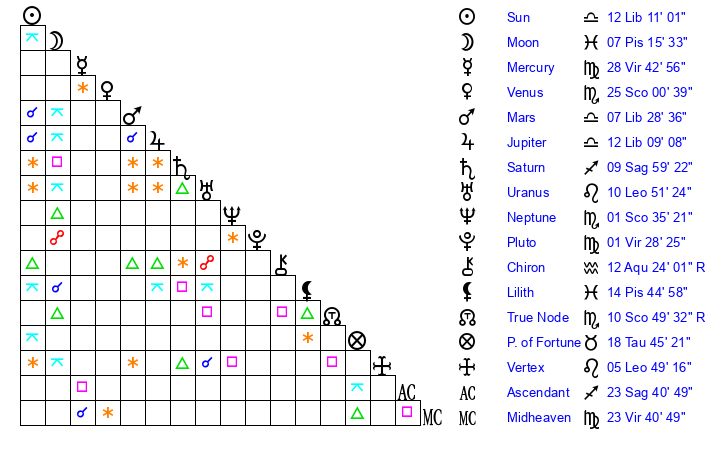 | Venus | 25 Scorpio 0 | 19 Virgo 52 | 4 Aquarius 50 |