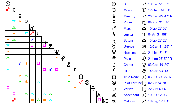 | Moon | 12 Gemini 10 | 0 Libra 27 | 25 Aquarius 45 |