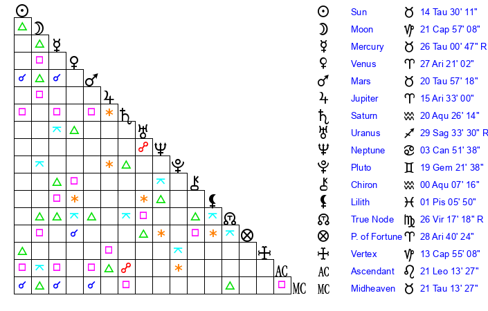 | Moon | 21 Capricorn 59 | 25 Leo 36 | 14 Gemini 22 |