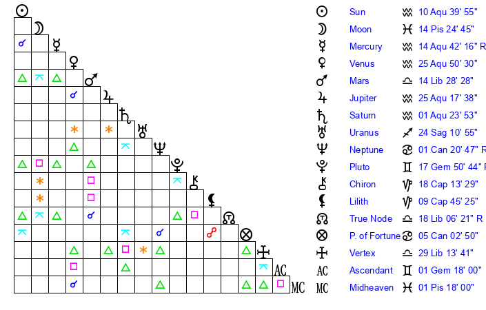 | Sun | 10 Aquarius 40 | 12 Aquarius 4 | 10 Gemini 58 |