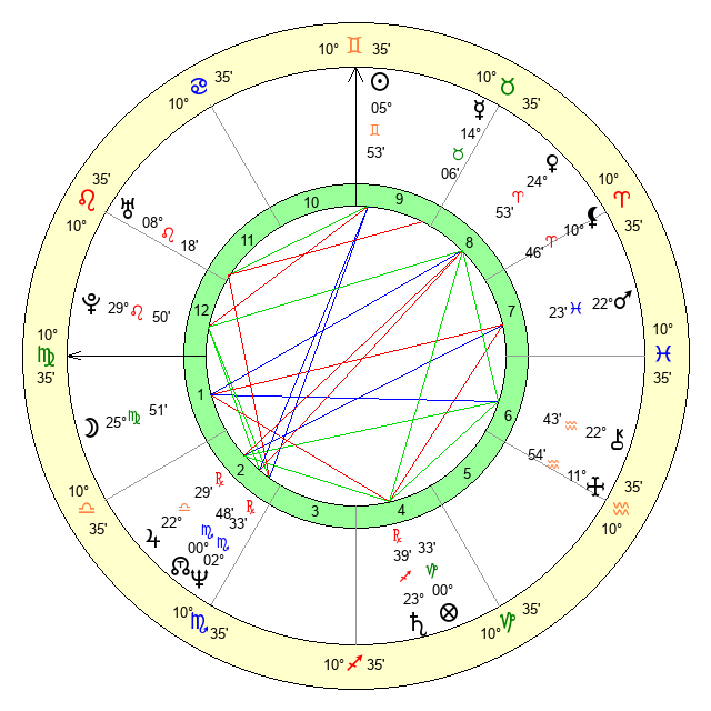 | Sun | 5 Gemini 53 | 6 Gemini 39 | 9 Leo 53 |