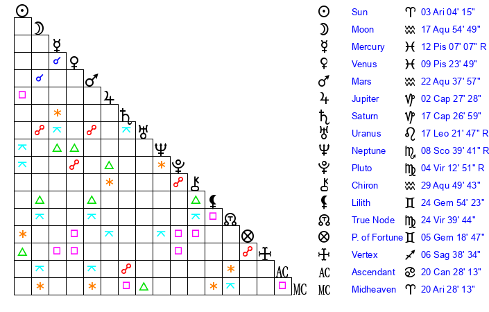 | Mercury | 12 Pisces 6 | 5 Aries 23 | 18 Gemini 17 |