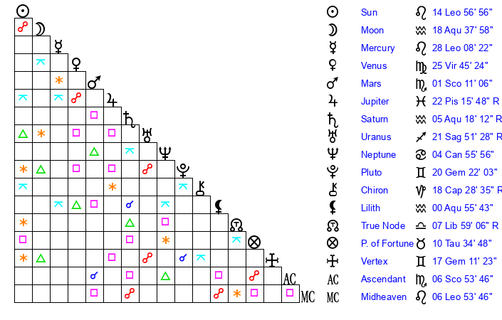| Moon | 18 Aquarius 43 | 8 Aquarius 41 | 8 Leo 51 |