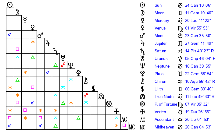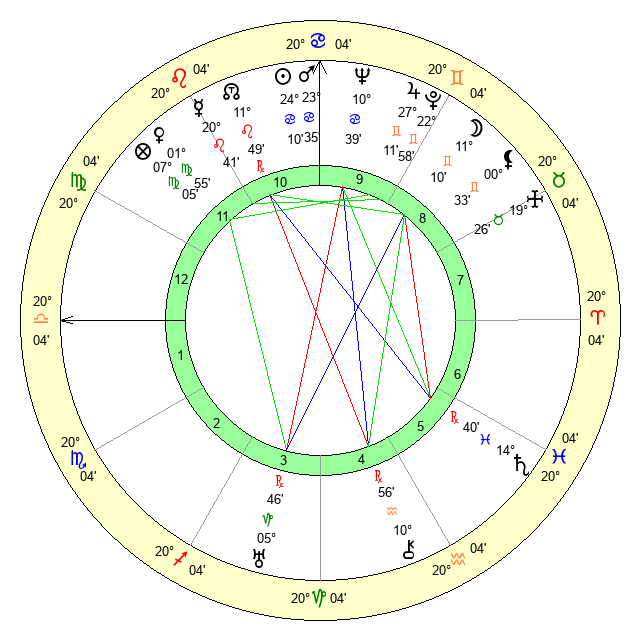 | Sun | 24 Cancer 10 | 25 Cancer 22 | 20 Scorpio 25 |