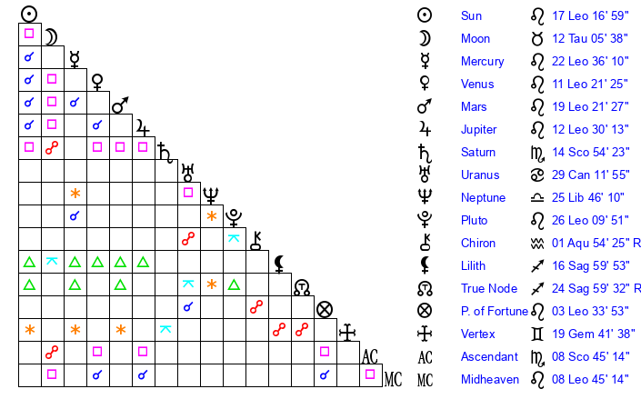| Sun | 17 Leo 17 | 18 Leo 19 | 25 Libra 32 |